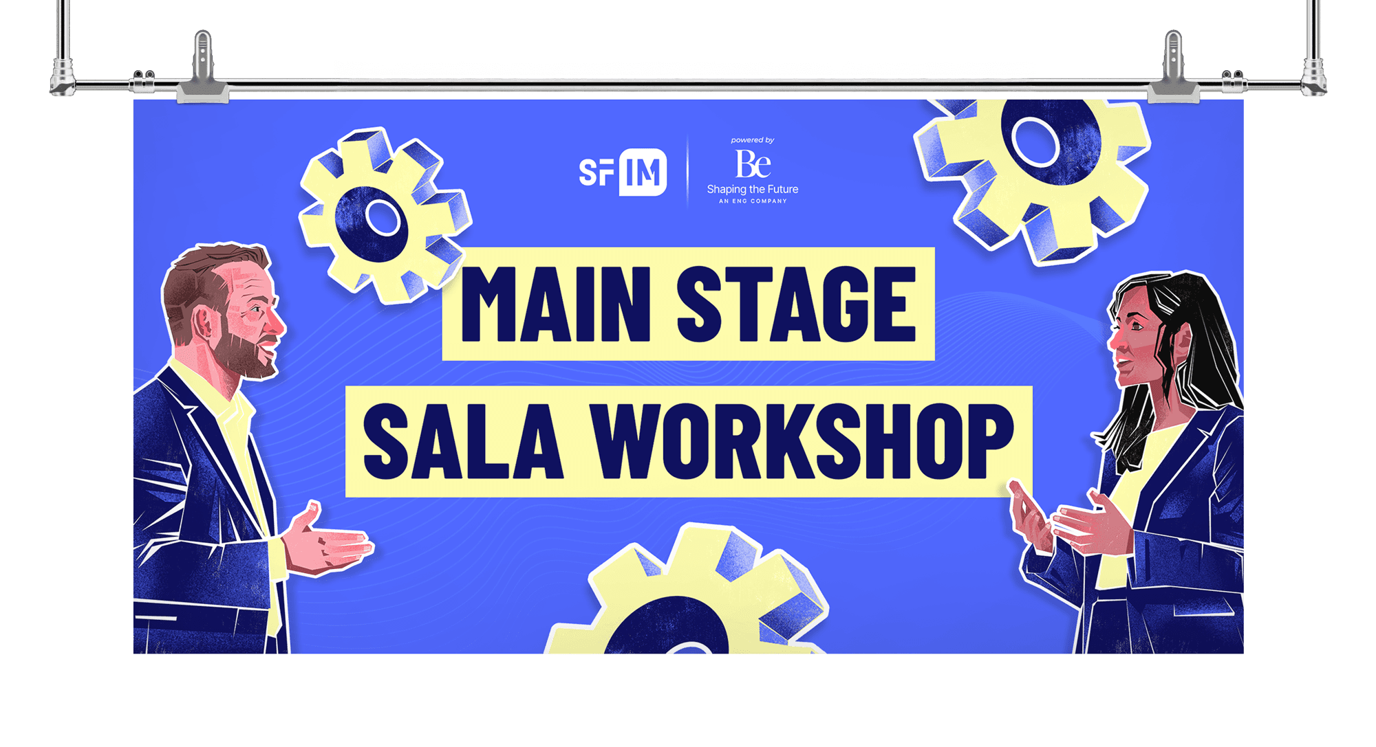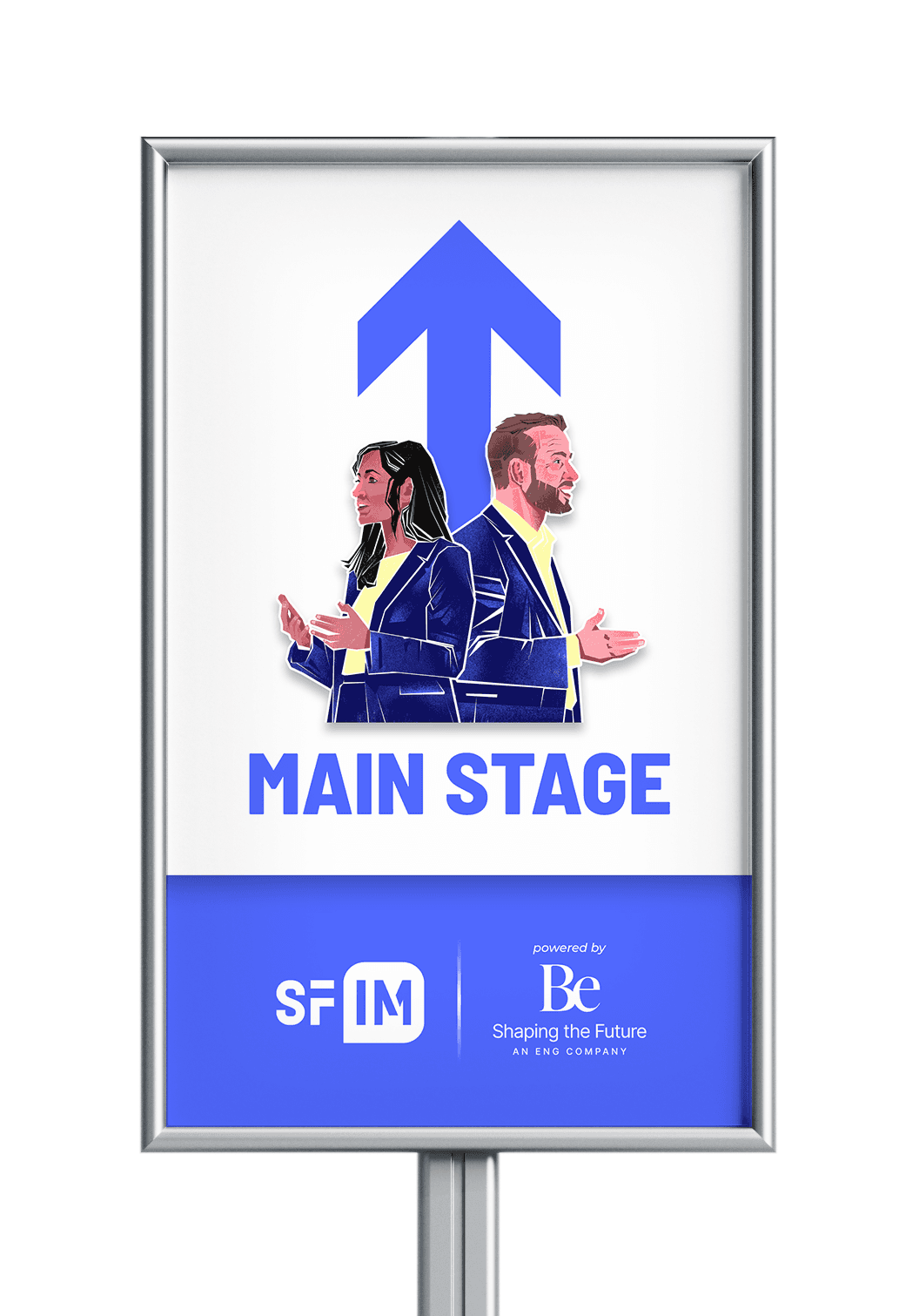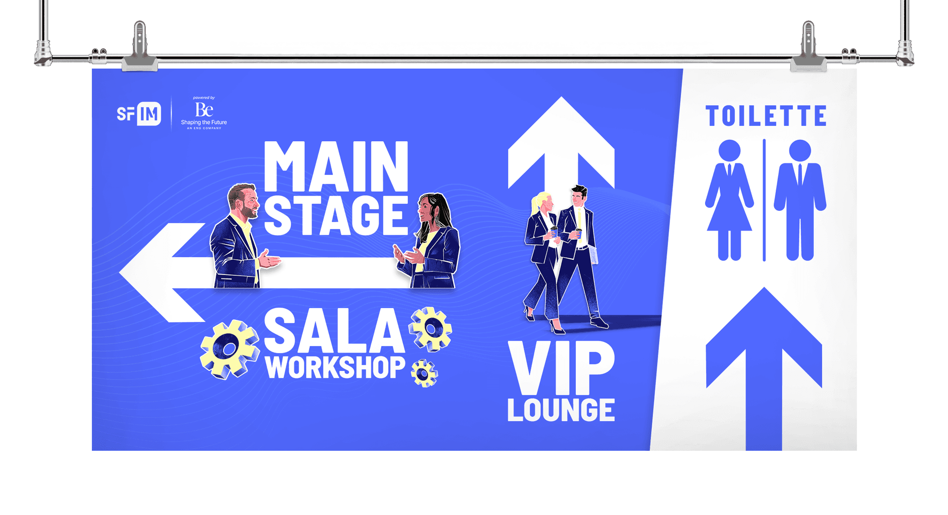 The visual system for the event space combines illustrations and flat color fields, guiding attendees and creating a cohesive on-site experience.
